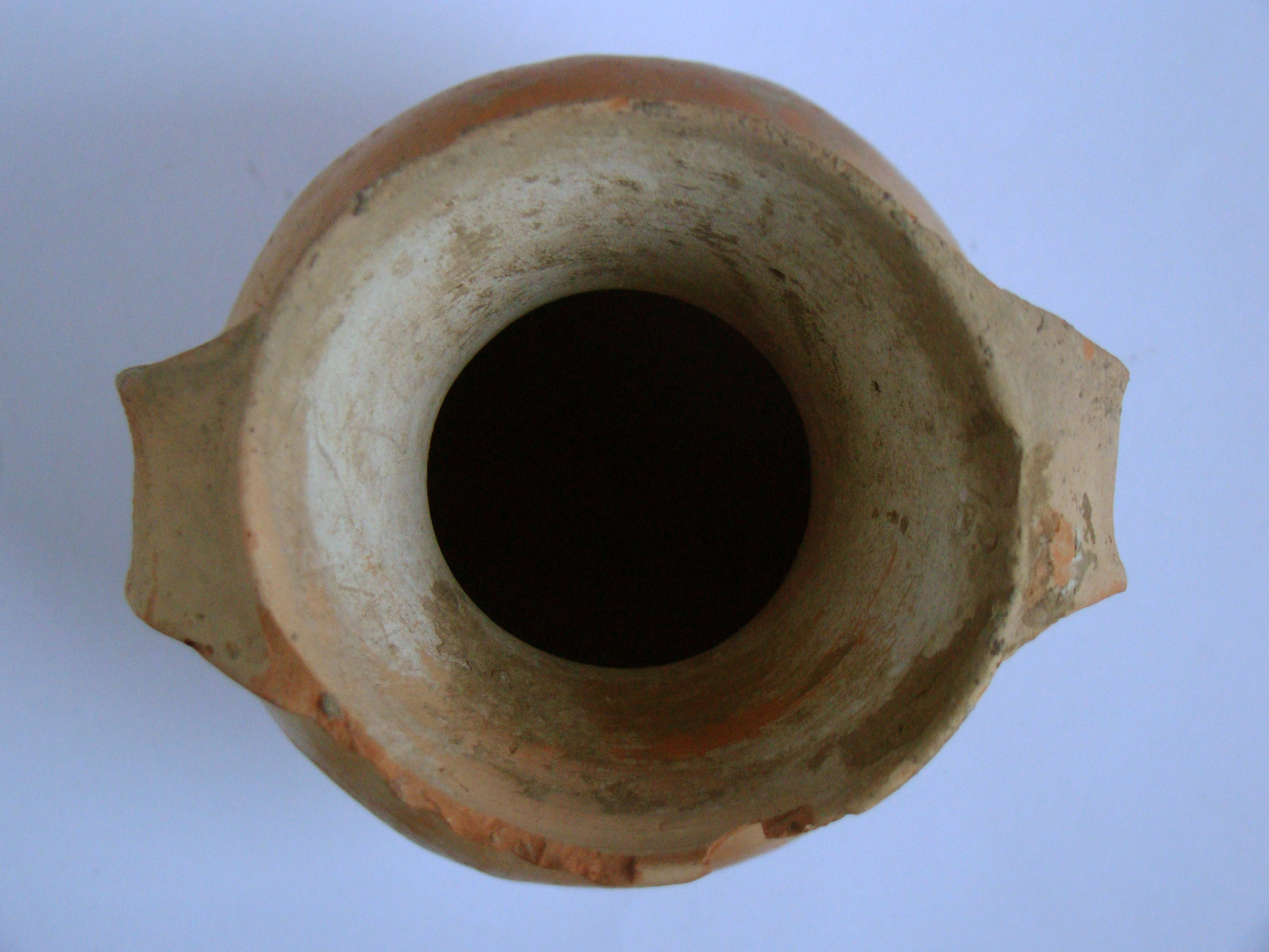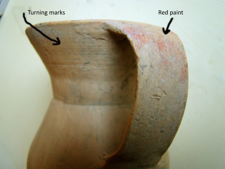Some pieces have pierced handles, or are three-handled. I have a second one in my collection, which I have doubts about its authenticity. It is a non-burnished example, and has some remains of red paint on it. The thing that raises the doubts for me is the turning marks on the rim,although the other one has a similar pattern. The body does absorb water quick though, and does smell like old pottery. Anyone who has an opinion on this one is welcome to comment. In the meantime: Matthew Page confirmed the Qijia dating on this piece.