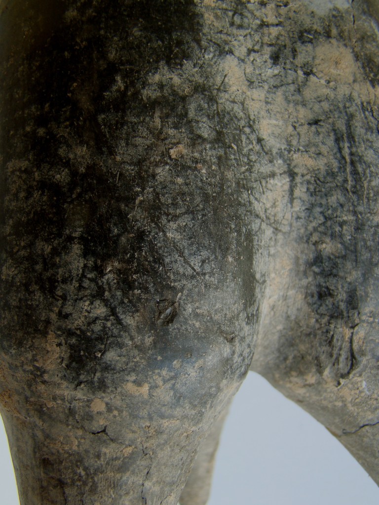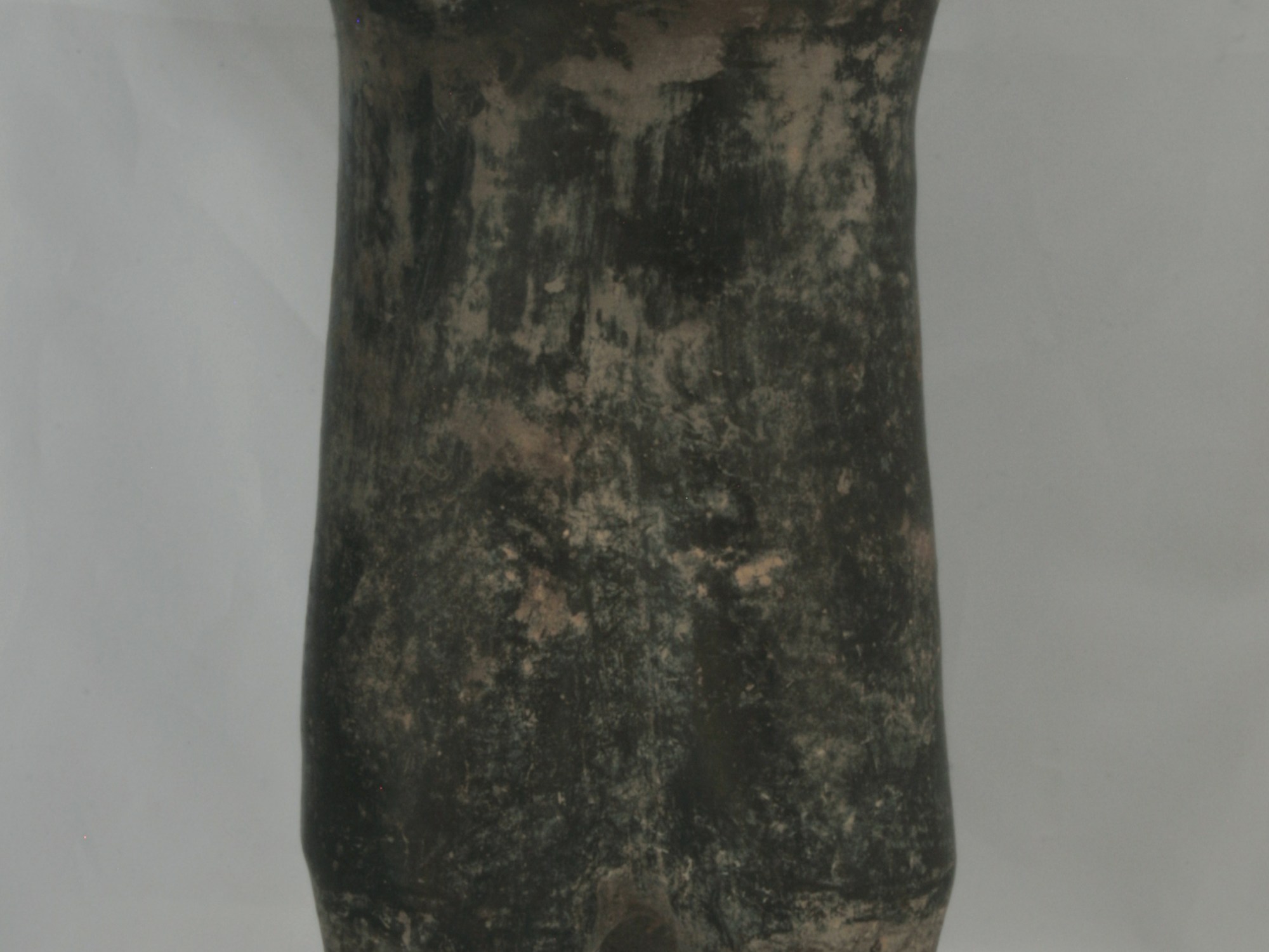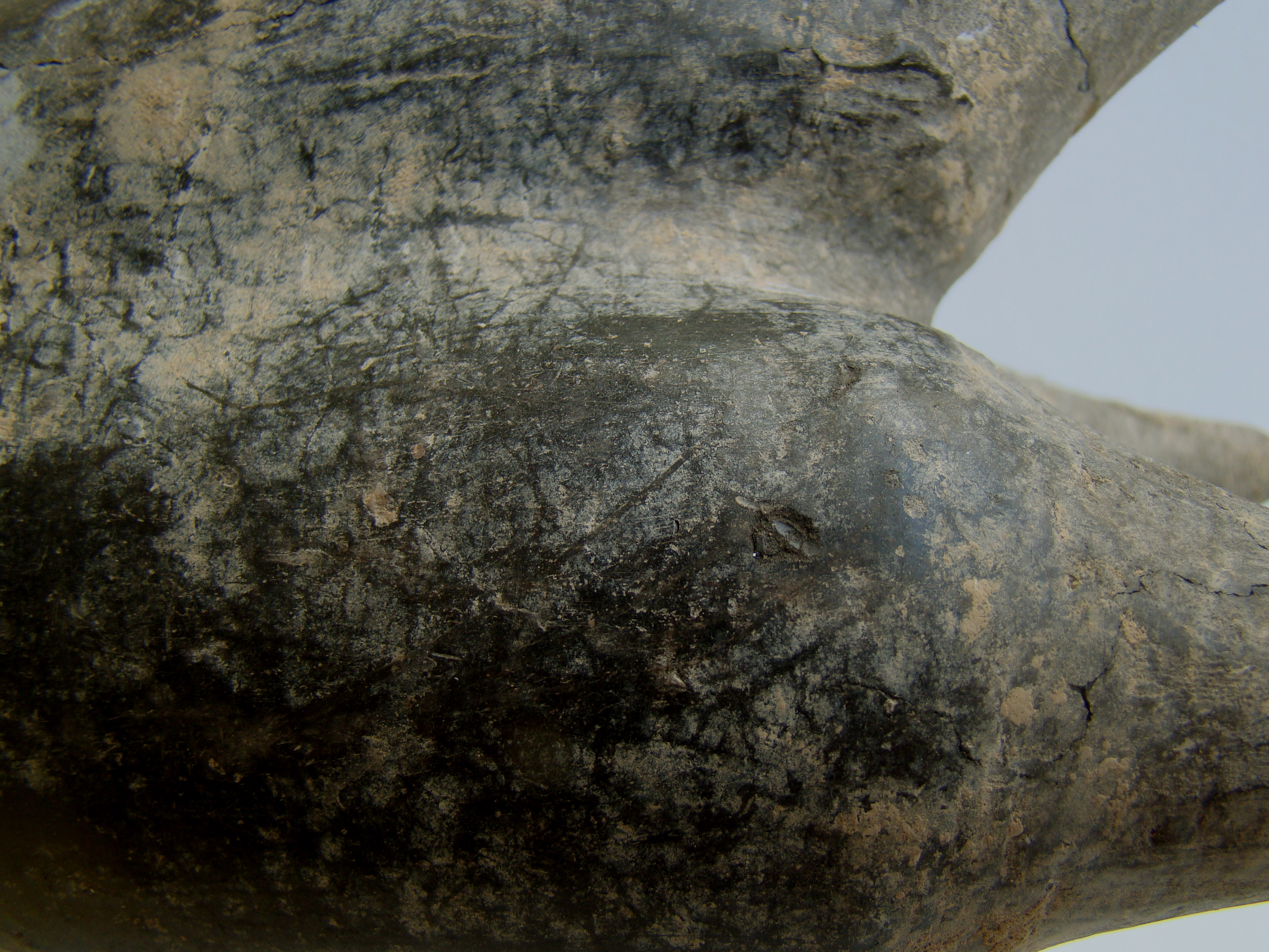 This is a three-legged tall pot, a shape the Chinese call Li. It is made from a brown clay which is charred black.I could see the coarse brown clay because one foot was broken. The charring was almost a centimeter deep. It is a heavy piece and it is 24,5 cm high. It has been crudely restored, and misses one piece of the rim. The black is burnished smooth on places. In the inside there are traces of roots. There are several cracks and breaks. It is from the Xiajiadian culture,(2200-1600 BCE); a bronze age culture in the north of China.
