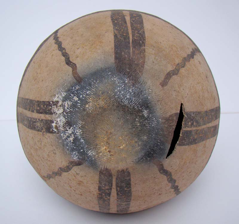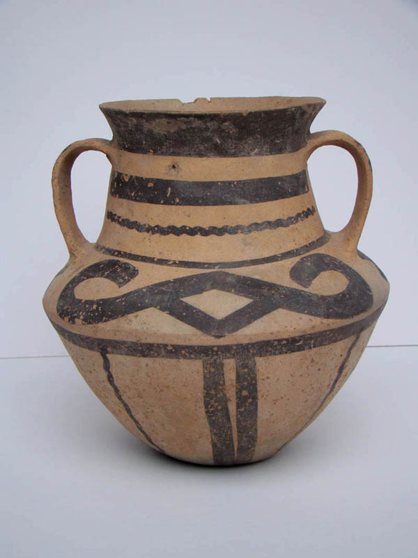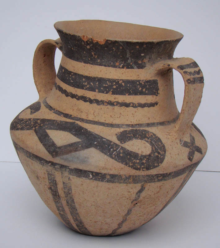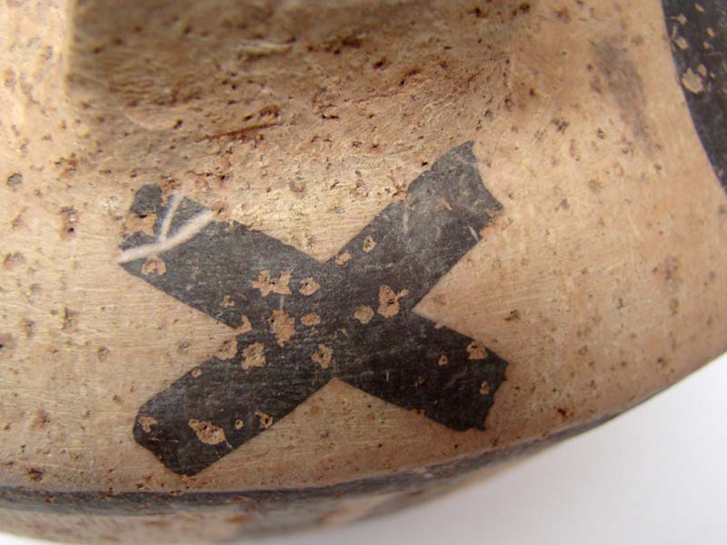 The painted design is a yoke-shape, classicly found on Xindian wares. There is much debate of what it is. Is it a Yoke, a bull, or an abstract shape ?