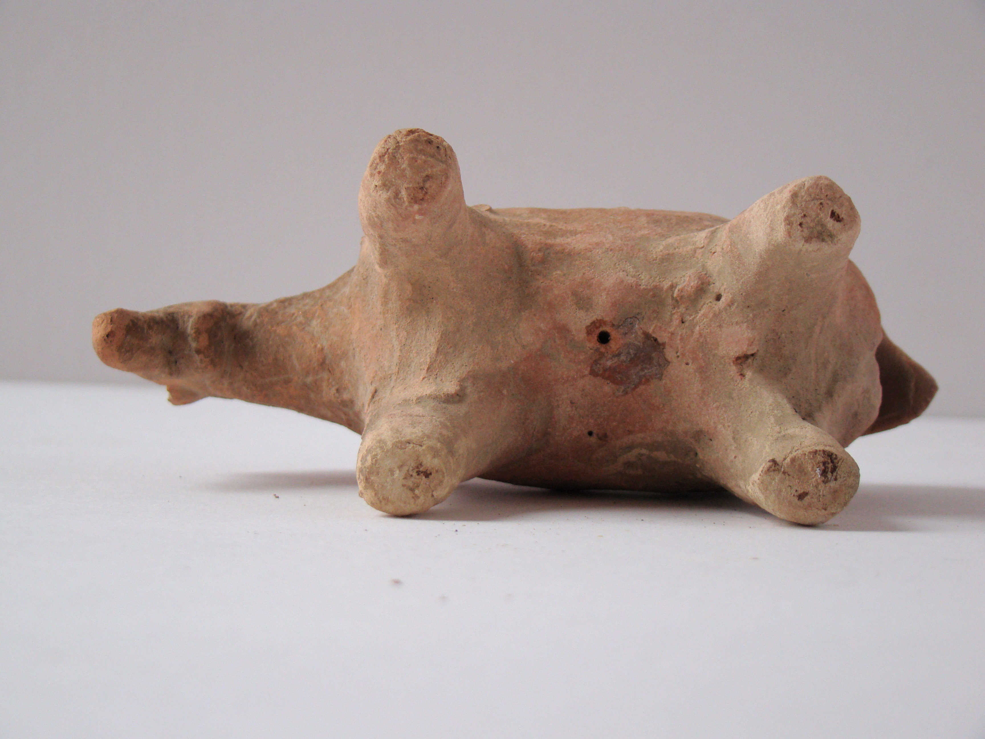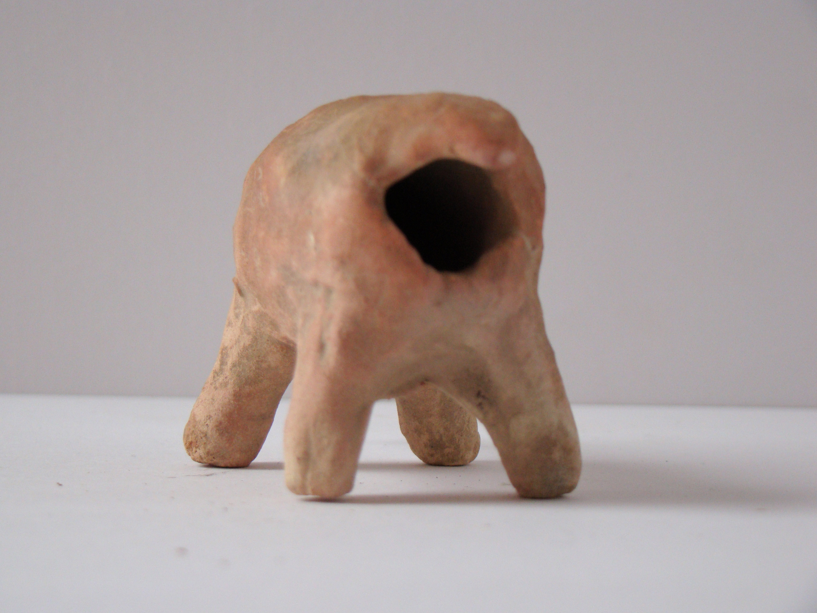 This small size animal is a bit of a mystery. It is made of a reddish pottery and measures 11 cm. It is hand sculptured and is hollow, with a hole in the back. First there is the nature of the beast, and I came to the provisional conclusion that it is an elephant. (female)