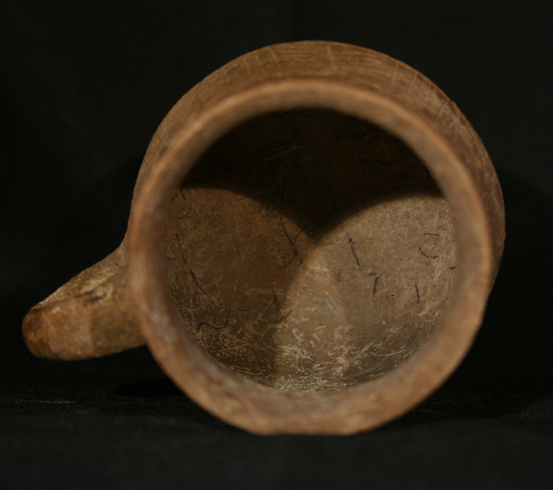 This cup is 10 cm high, and made from a high fired brown pottery. It is thin-walled with a rounded base. The surface is heavily encrusted due to long burial.