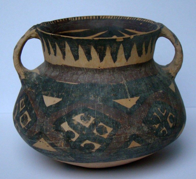 This is a jar from the Majiayao culture, or also known as Gansu Yangshao culture. It dates between 2300-2000 BC the Machang Phase, and is from Gansu or Qinghai province.