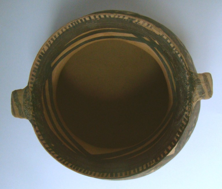 While being shaped these pots rested on a piece of fabric, which leaves an imprint on the bottom. The undersides are also undecorated, because they rested on the floor, and paint would get dirty or wear off. An other theory is that these pots were grave-gifts, and could only be seen from the top. So there was no need to decorate the bottom.
