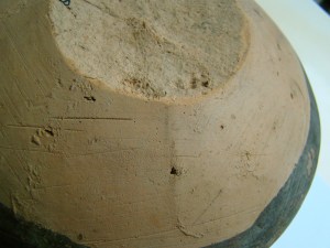 These pots were hand formed, not on a turning wheel. You can see scrape markings on the outside, from shaping and thinnig the clay.