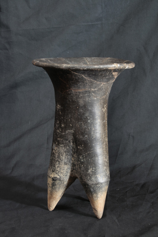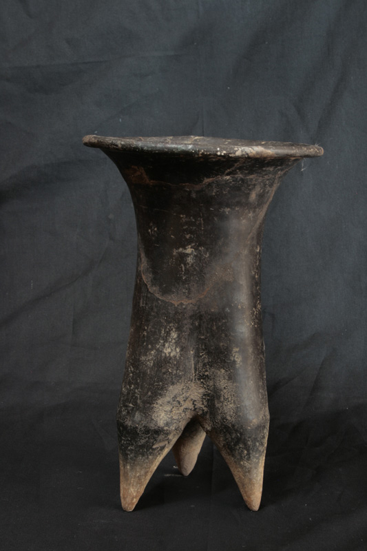 These vases are very typical for the Xiajiadian culture. A monumental shape, with three legs, sometimes referred to as goat’s teeth. Ritch carbonated pottery, a cooking vessel that could stand in a fire. Dated around 1500 b.C. This example is as most examples reconstructed, but almost all from original pieces. One piece missing on the rim. The Xiajiadian culture is divided in the Lower and Upper Xiajiadian. These vases are mostly dated in the Upper phase, a bronze culture, in southeast Inner Mongolia.