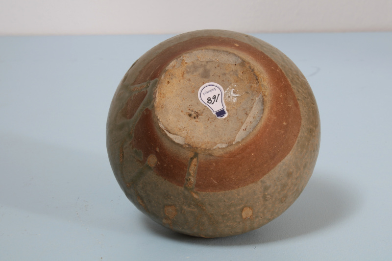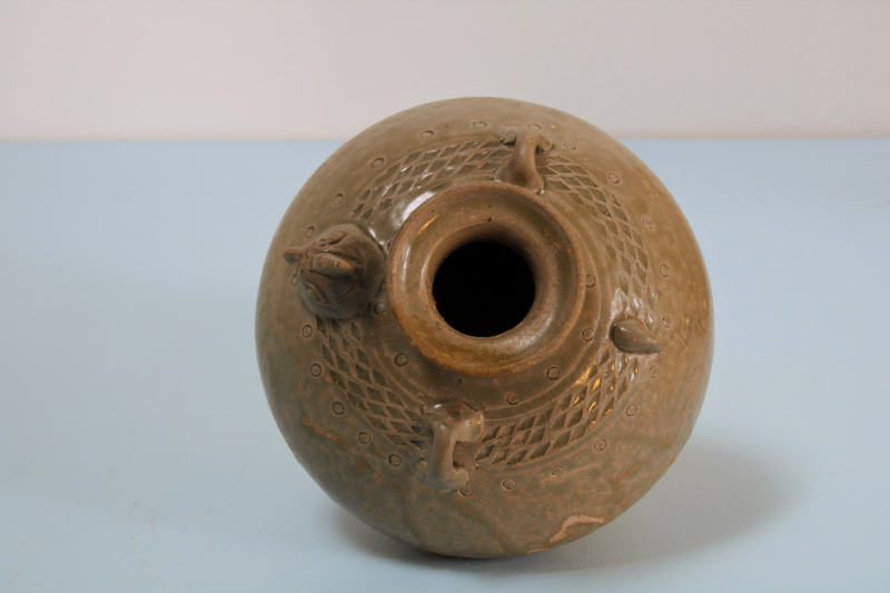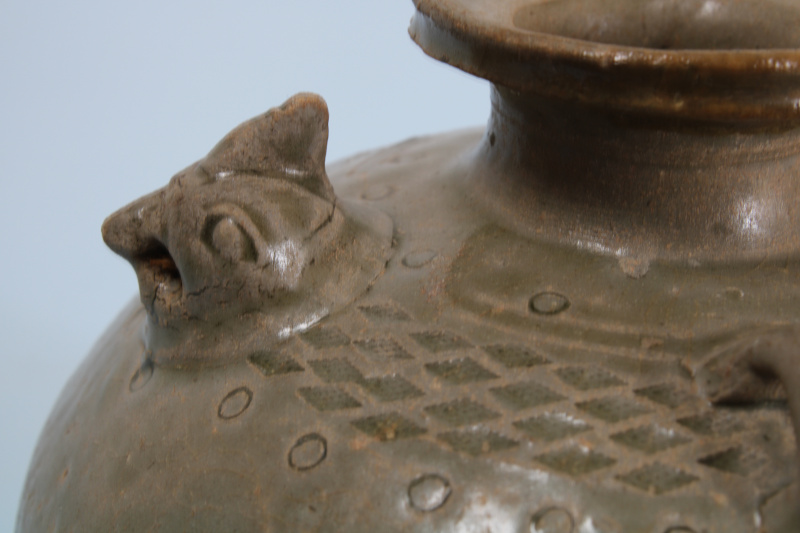 I found this pot in a Dutch auction. It was described as probably Song dynasty. It was provenanced to a Sotheby’s auction, from the Philips collection. It seemed much earlier then Song to me so I took a shot at it. I bought the original Sotheby’s catalogue, and it was in there with the same description, namely Song dynasty. The pot is quite small; it is 10 cm high, and made from a grey stoneware. The glaze is cloudy green, a Yue type of glaze. The decoration is a chicken head and tale, not functional as ewer. A checker-like pattern is impressed, and some circles. There is an old repair to the rim. After some searching I believe this ewer is to be dated to the Western Jin, because of the impressed pattern, the small size, and no handle. The early ones also have no active spout.