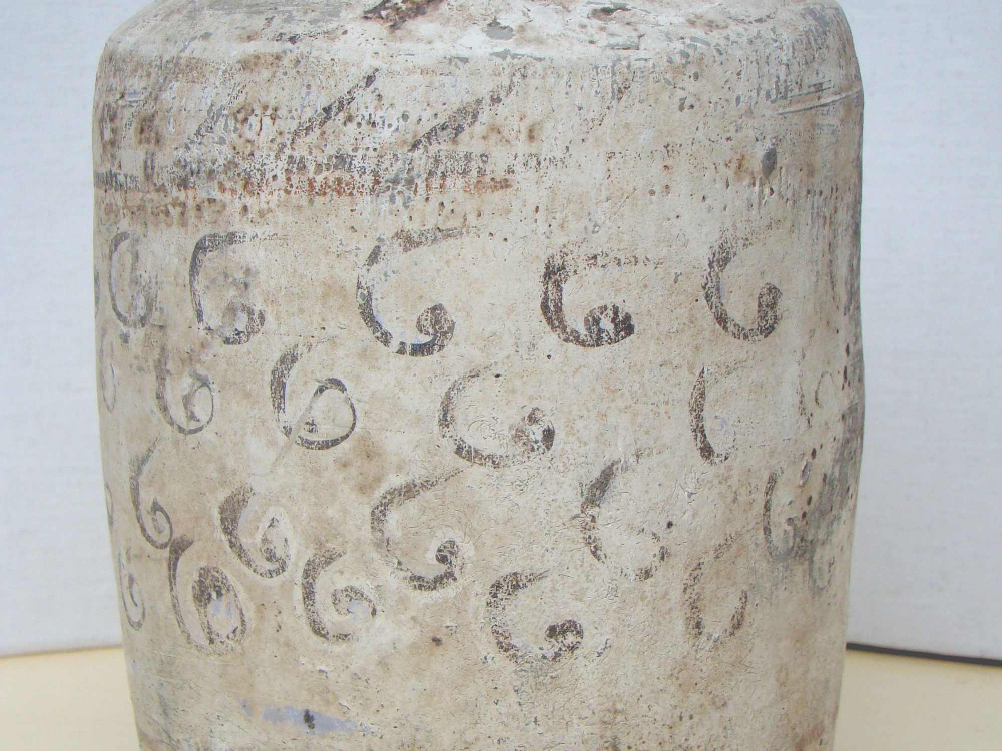 The surface shows wear according to a long burial, and dark spots from fungous. These are often imitated using black paint, splashed over a replica. There is a difference when carefully examined. Winebottles are relatively rare in Han pottery.