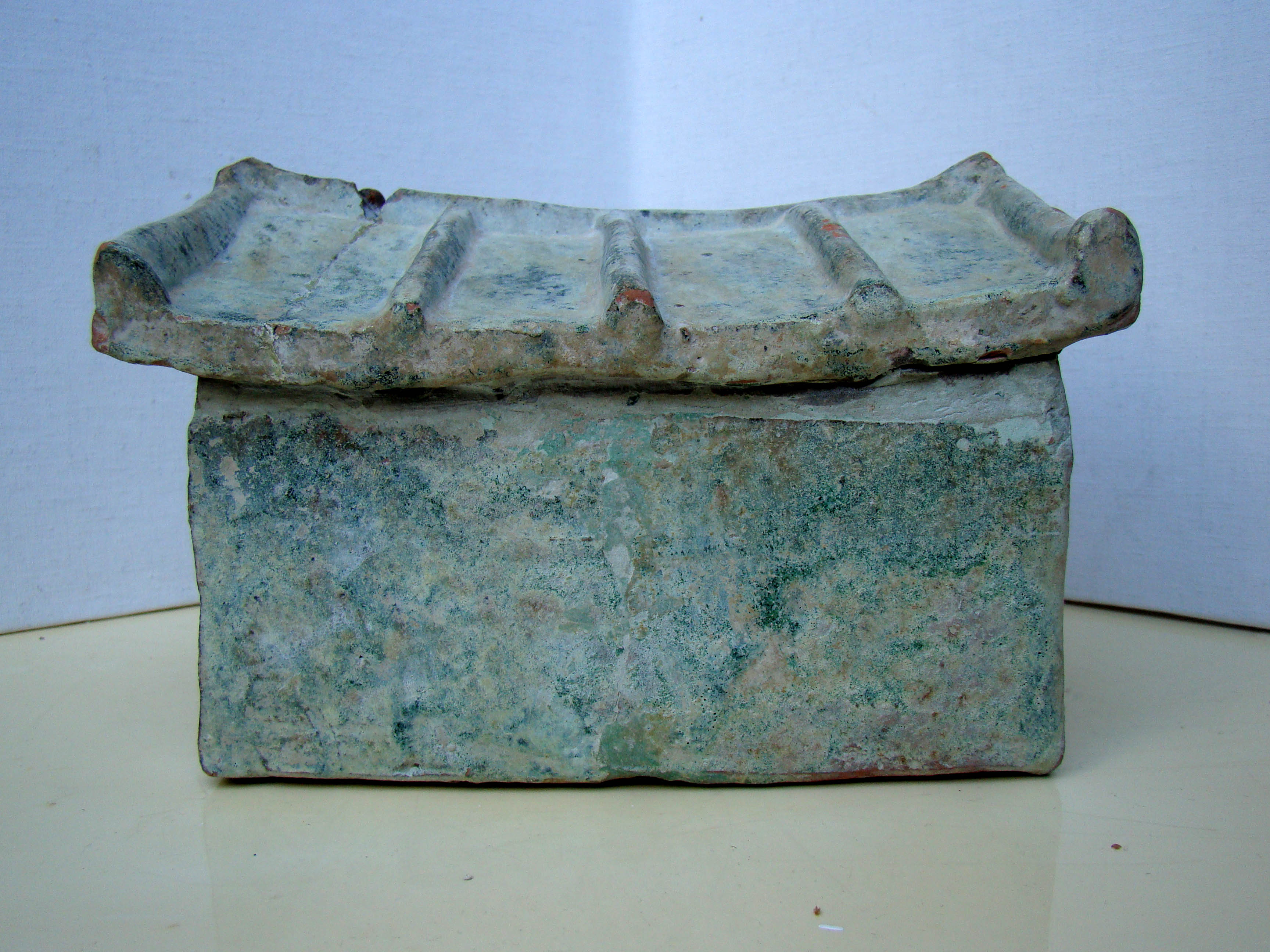This model of a mill came as a sort of surprise to the purchase of my Han dynasty well. It is 20 cm wide, 14 cm high and 15,5 deep. It is covered in a green lead glaze, which is iridized due to long burial. It is to be placed in the Eastern Han dynasty, second half first, early second century a.D. It is a repaired piece, with some filling in. We can see a mill, and a loose mortar. Similar pieces in the Ontario museum, and Henan provincial museum.