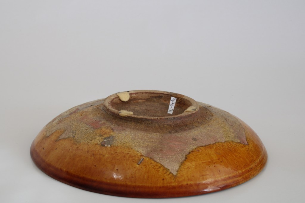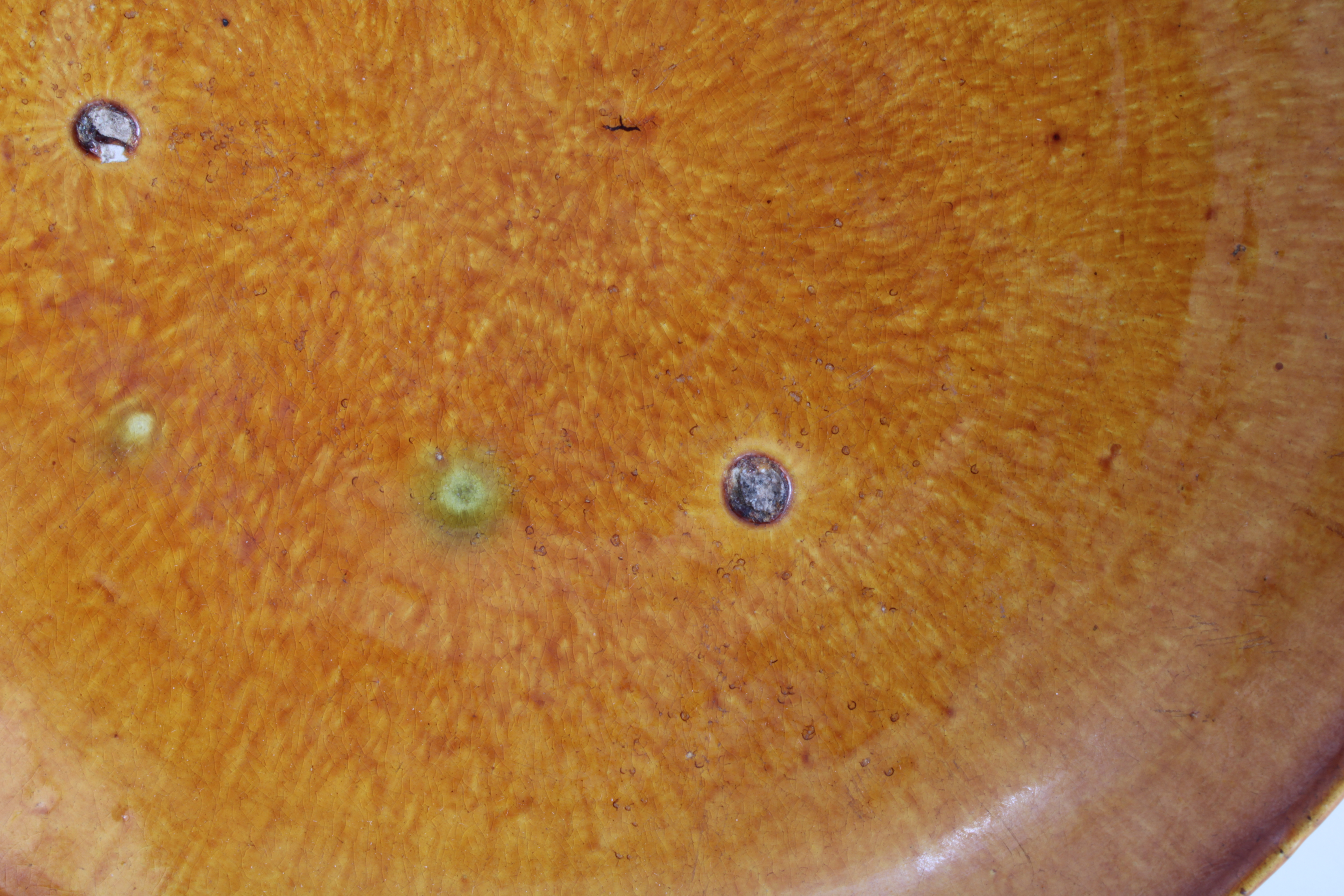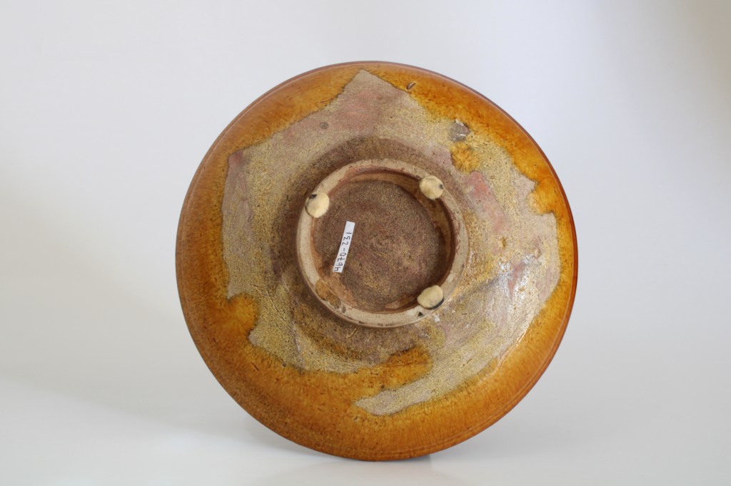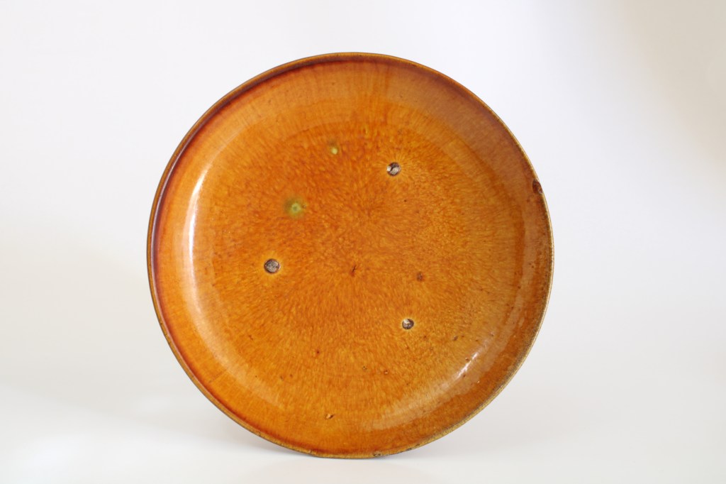 An amber glazed Liao dynasty plate. A rough stoneware with a rich amber colored glaze, 19 cms. From the estate of Jack Faxon, Birmingham, senator, and creator of the Michigan council for the arts. The glaze is exceptional and a world withing a world. Typical tripod marks on the inside.