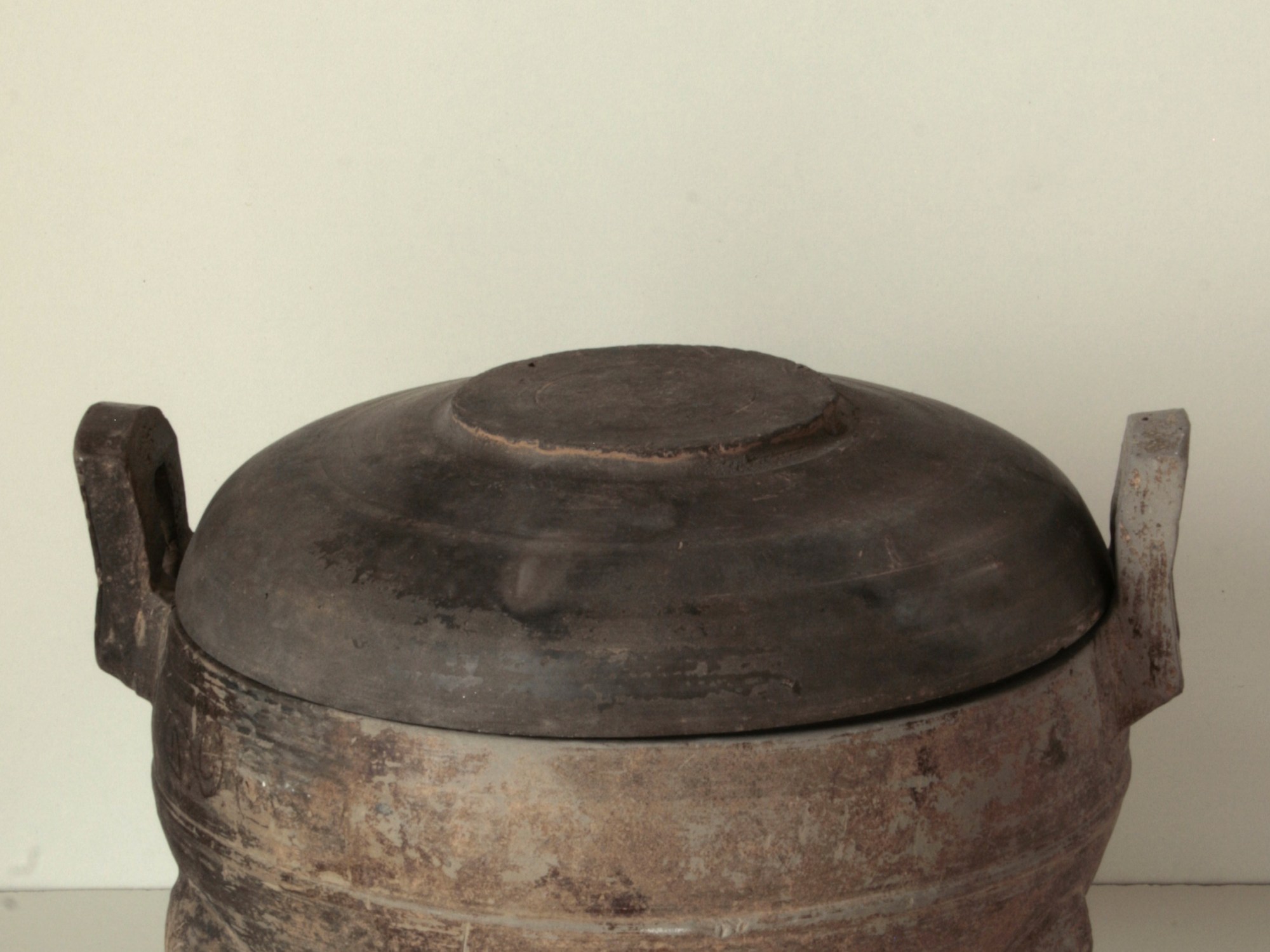 My ding is 30,5 cm across, and 23 cm high. It is made from a grey pottery, and has a band of cold painted black decoration. It is Han dynasty, 206-220 AD, where a broad range of these vessel were made. They also appear glazed, and extensively painted. It is likely made in the Western Han dynasty, the ceremonial vessel as a grave gift almost disappeared in the Eastern Han dynasty. In the grave they were accompanied by a range of other gifts like models of buildings, stoves, wells, pig-sties, a.s.o. This points to an era of wealth and economic growth.