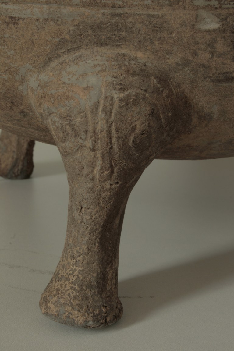 The ding is a very old form of vessel that originates in bronze vessels. They were used for offerings to the gods for the ancestors of the family. These bronze vessels could be placed over a fire to warm the contents, usually blood or meat offerings. Already in early times these vessels became symbols of wealth. The pottery version copies these early bronze examples, and is more a grave good than a useful tool.