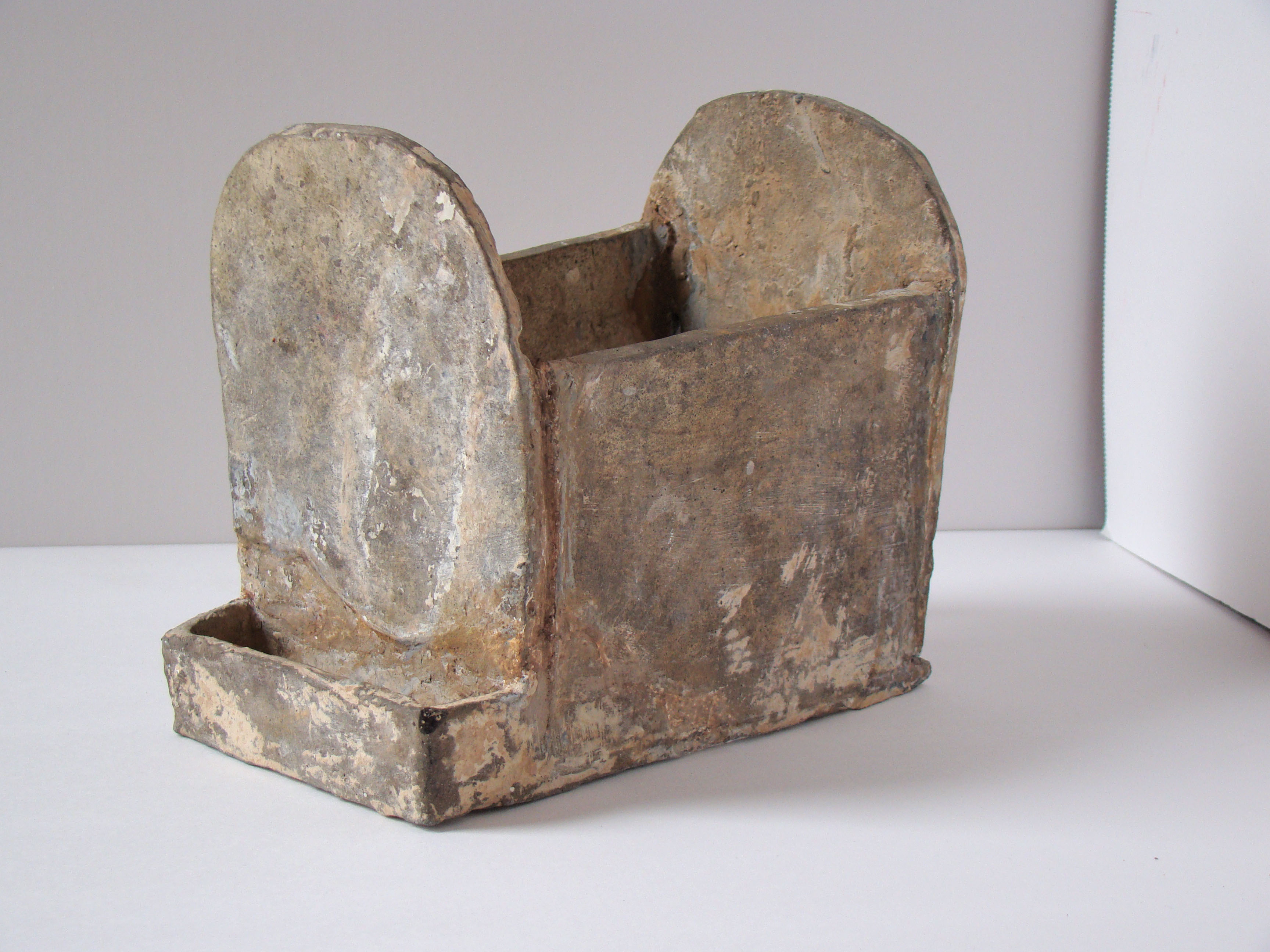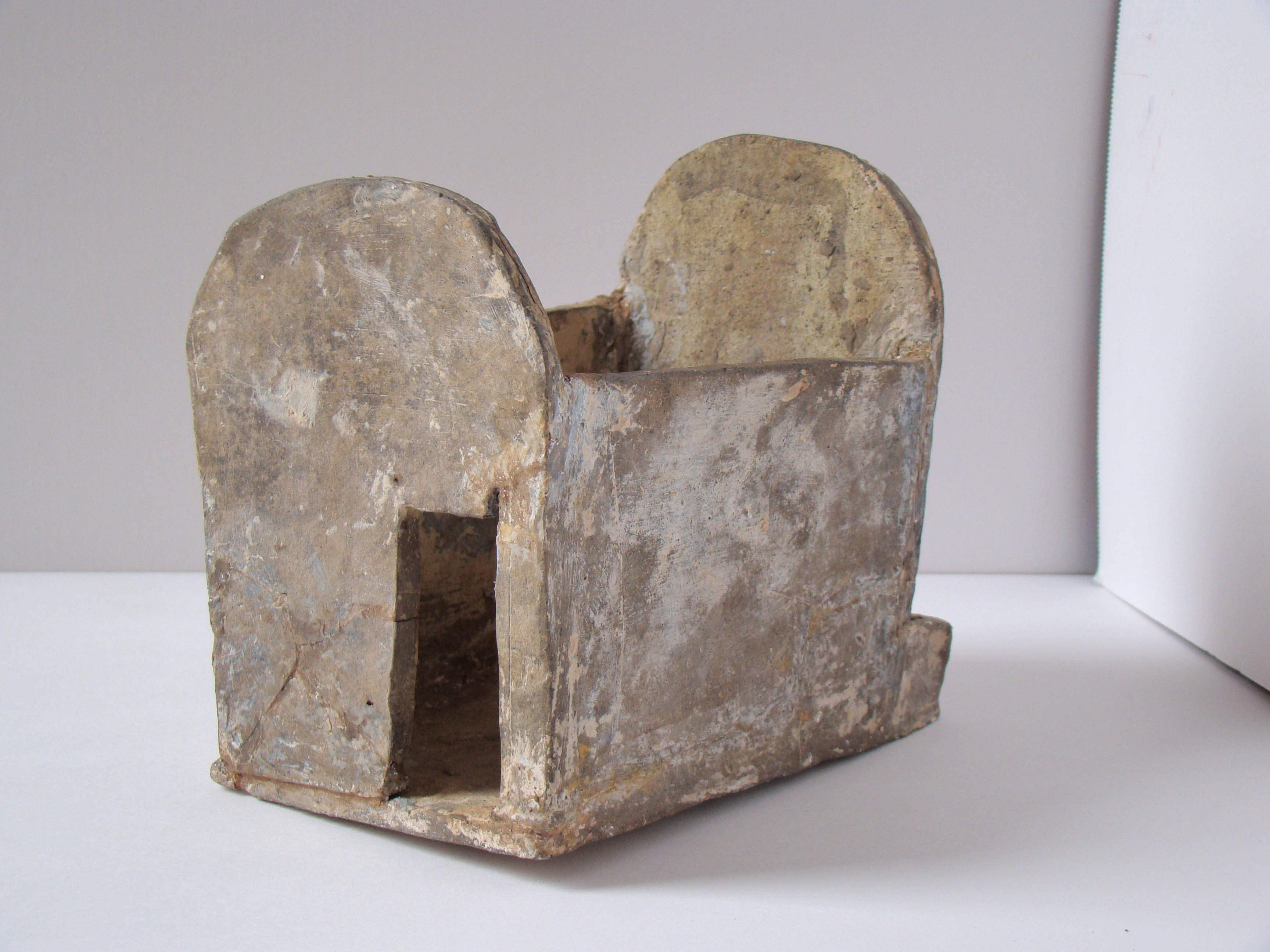 This model of a building was made in the Eastern Han Dynasty (AD 25 – 220) It is probably a pigsty. It is simply made of slabs of grey clay. This simplicity is it charm, it becomes an iconic form of a shed. The piece was coarsely restored, and after taking it apart, I re-restored it as simple as possible. This piece was made for in a tomb, and represented an actual building.