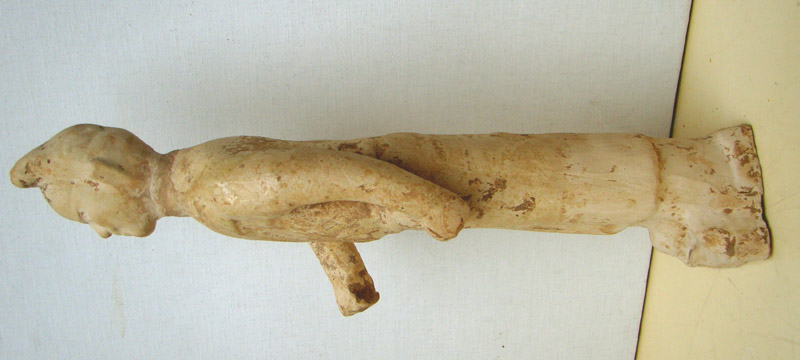 I bought this Tang groom at a local auction. It is 32,5 cm. high and made from a white porous pottery and partially covered in a clear/yellowish glaze.Quite a good size, and clearly a horse groom.