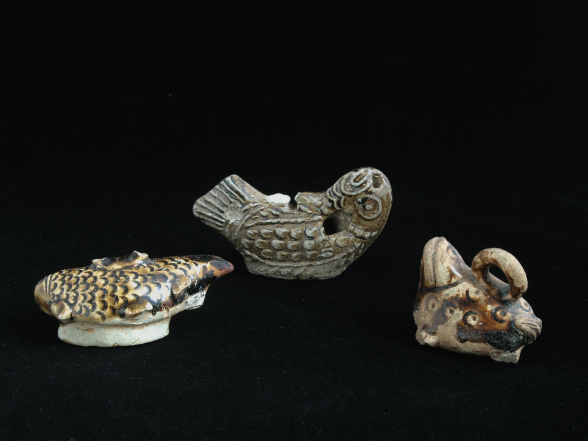 The middle one is a fish-shaped whistle. It still works when blowed, and was possibly made as a toy. The little loop handle is broken.