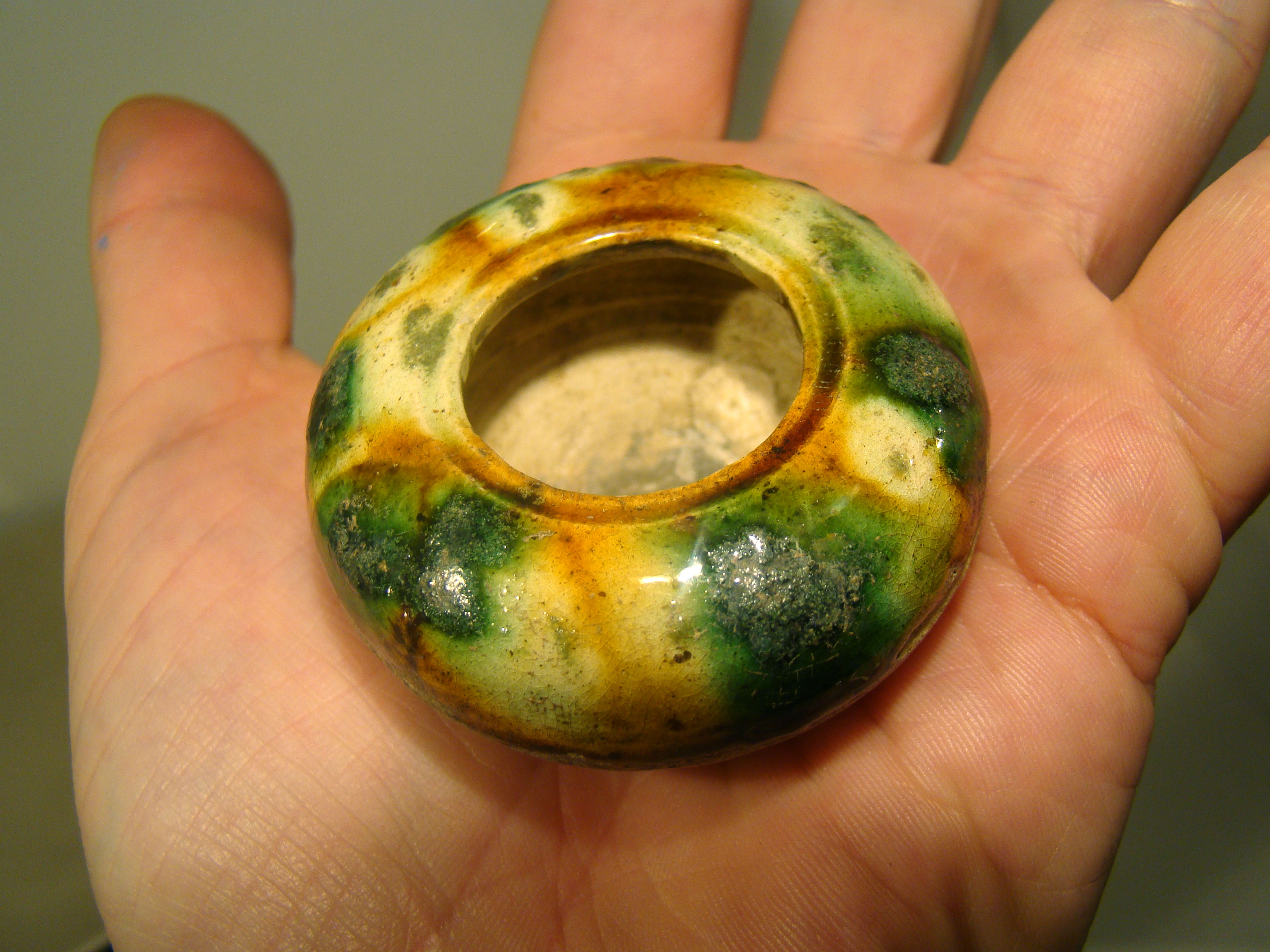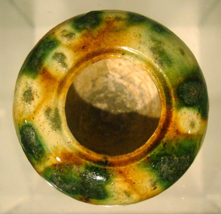 It measures only 5 cm, but is beautifully potted. The clay is a white Kaolin based clay, smooth from a lot of handling. The three colored Sancai glaze covers the top half of the outside. It dates from the Tang dynasty 618-907.