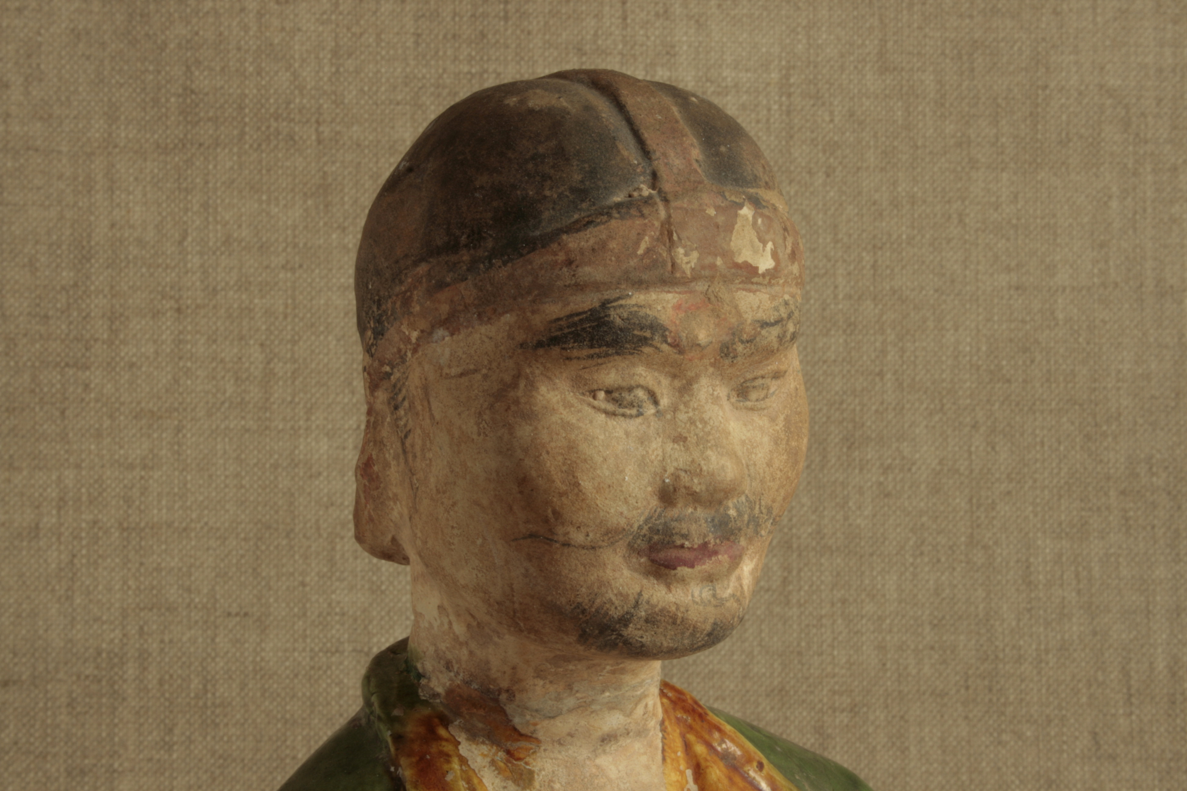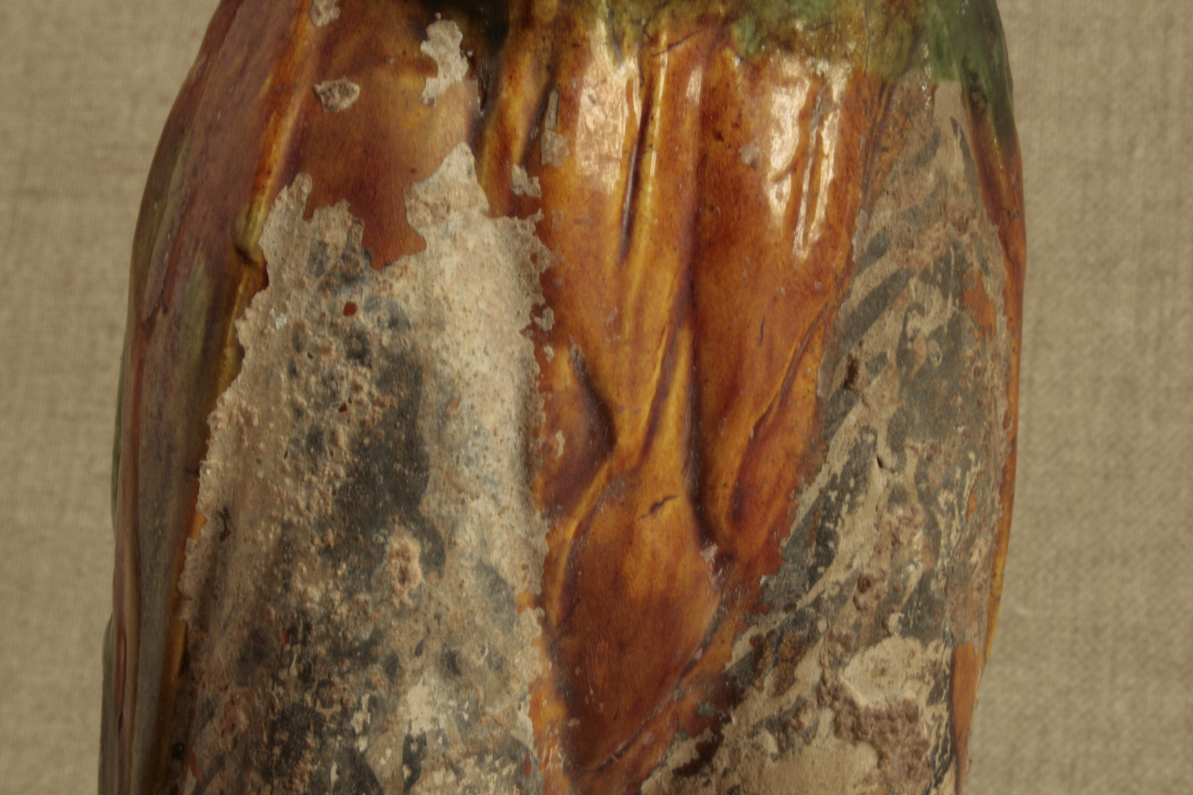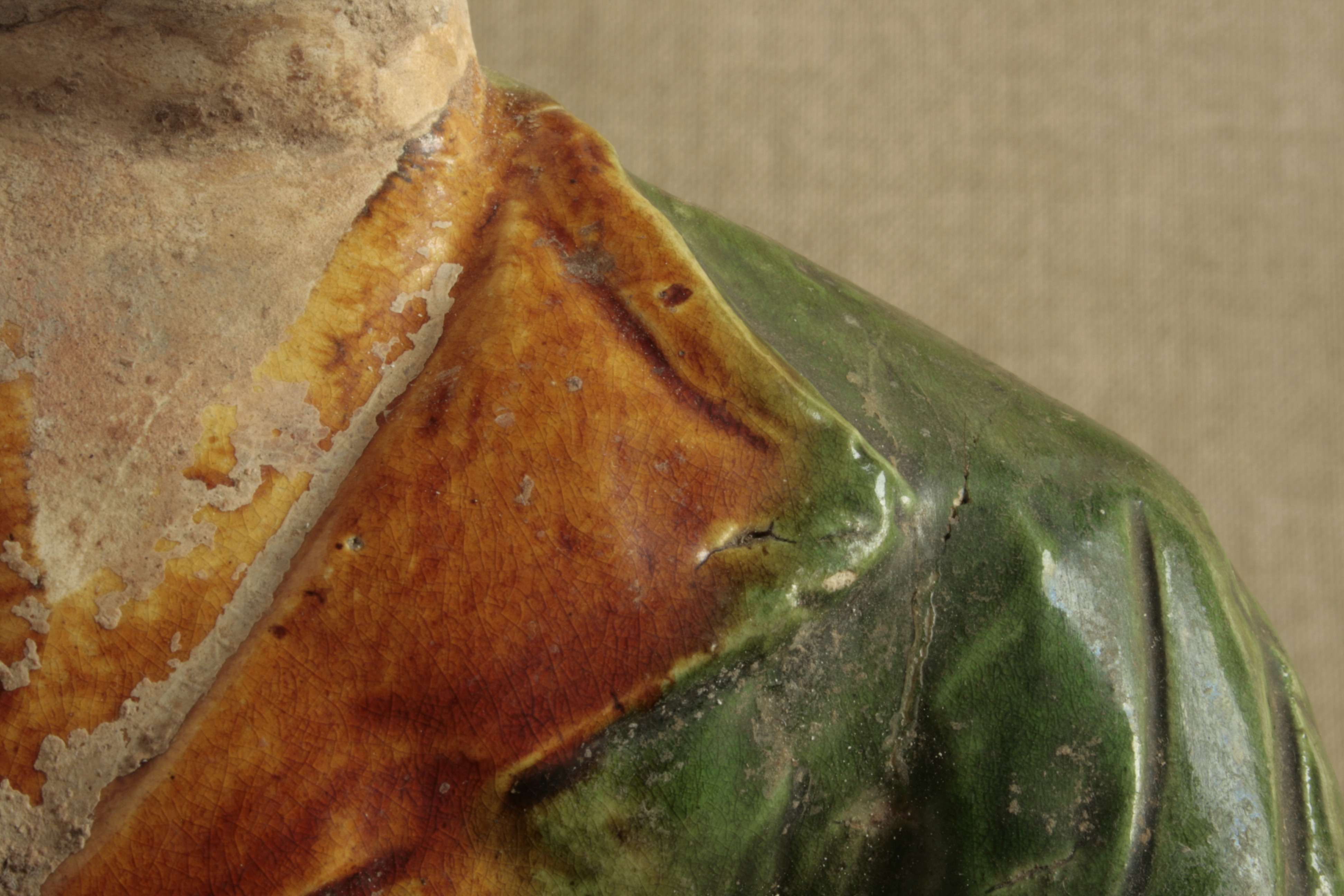 I touched-up the repairs and started my research. I had never seen paint partially painted over the glaze. The glaze is i.m.o. a true Tang glaze, and all parts turned out to be original. The broken feet matched the body, and the head is original. Some glaze overran the break, to prove that.
