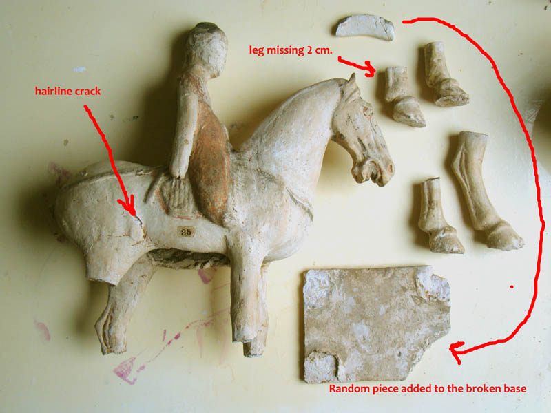 That was a good opportunity to check the horse out. The body was one solid piece, as could be seen from the inside. All parts were there, and were all original. They fitted nicely, and were made of the same coarse pinkish clay. It became apparent that it was a Tang dynasty piece.
