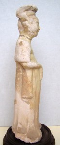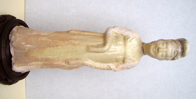 This lovely, stylish lady dates to the Sui dynasty (581–618 aD) . She is 21 cm’s high, the body is a pinkish white clay, and very poreus.The glaze has flaked off,