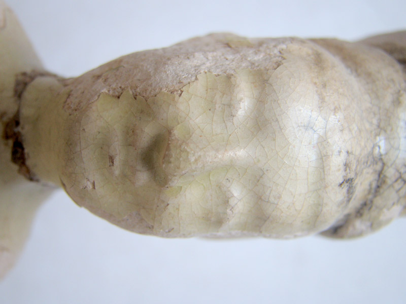 The earth smell immediately rubs off on your hands. The head has been re-attached, and the foot is chipped. The hole in the side is most likely from a probe, used to search for hollow spaces under the ground.