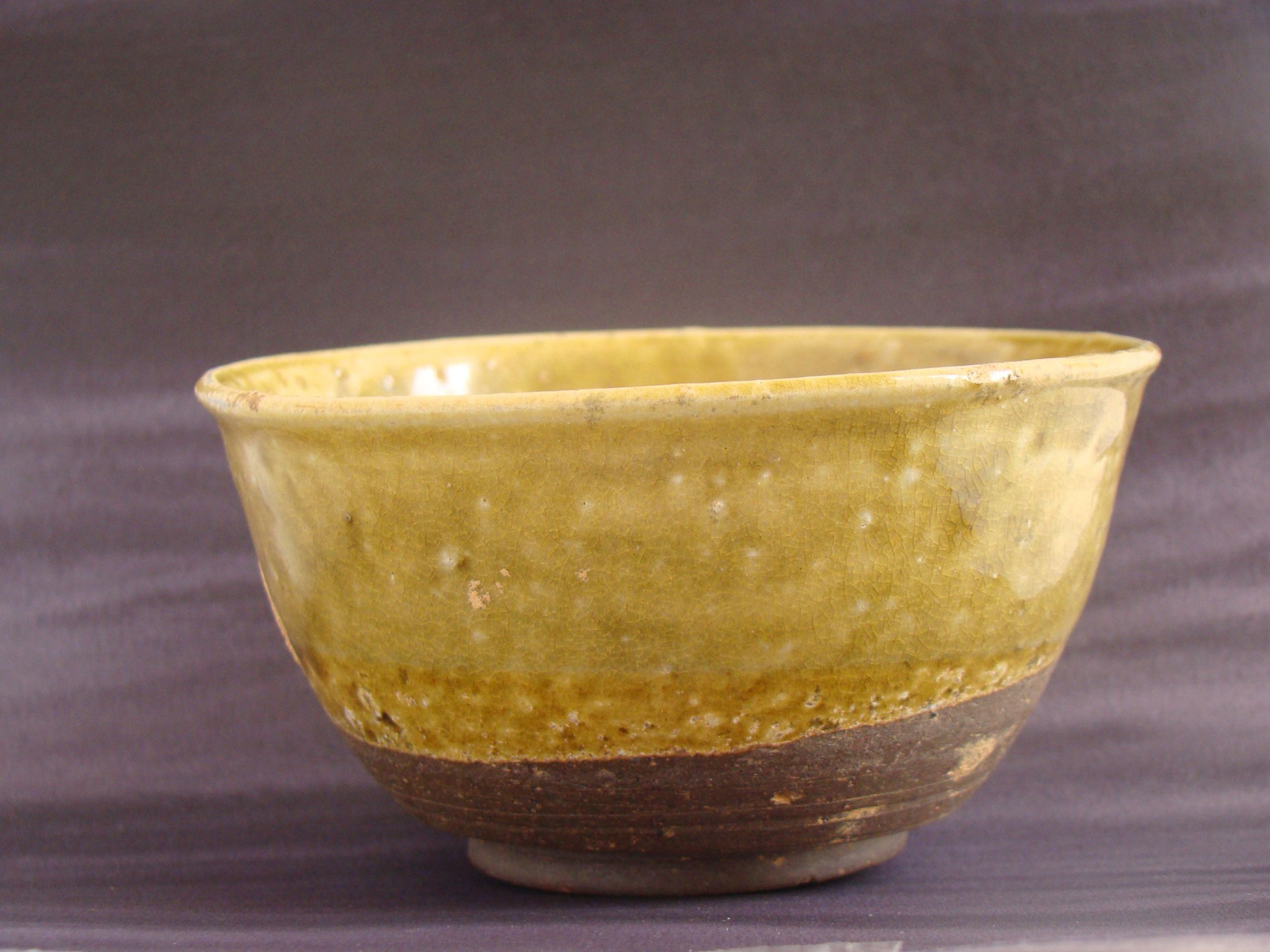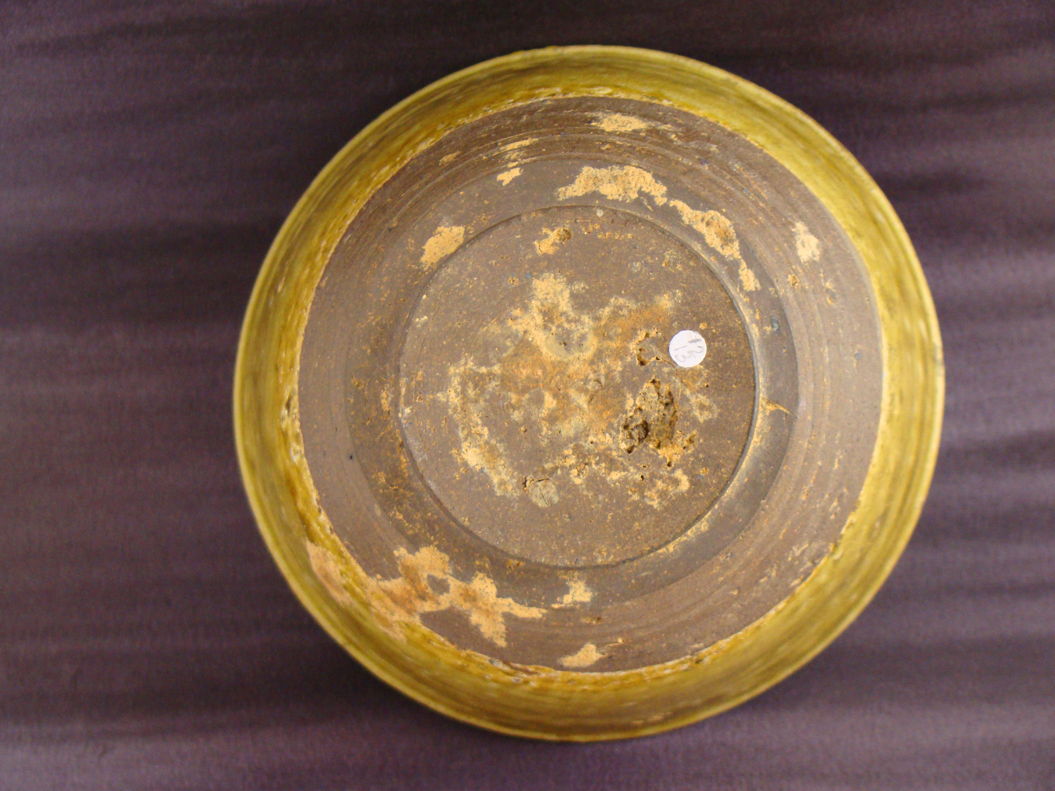 I purchased this bowl from what seemed a good collection. It is 6 cm. high, and 11,5 cm across. It is made of a dark brown pottery, which is high fired. It does not absorb water quick, but it has a pottery smell when wet. The glaze is yellow/green and glassy. It is crazed and shiny, and has not much wear on it.