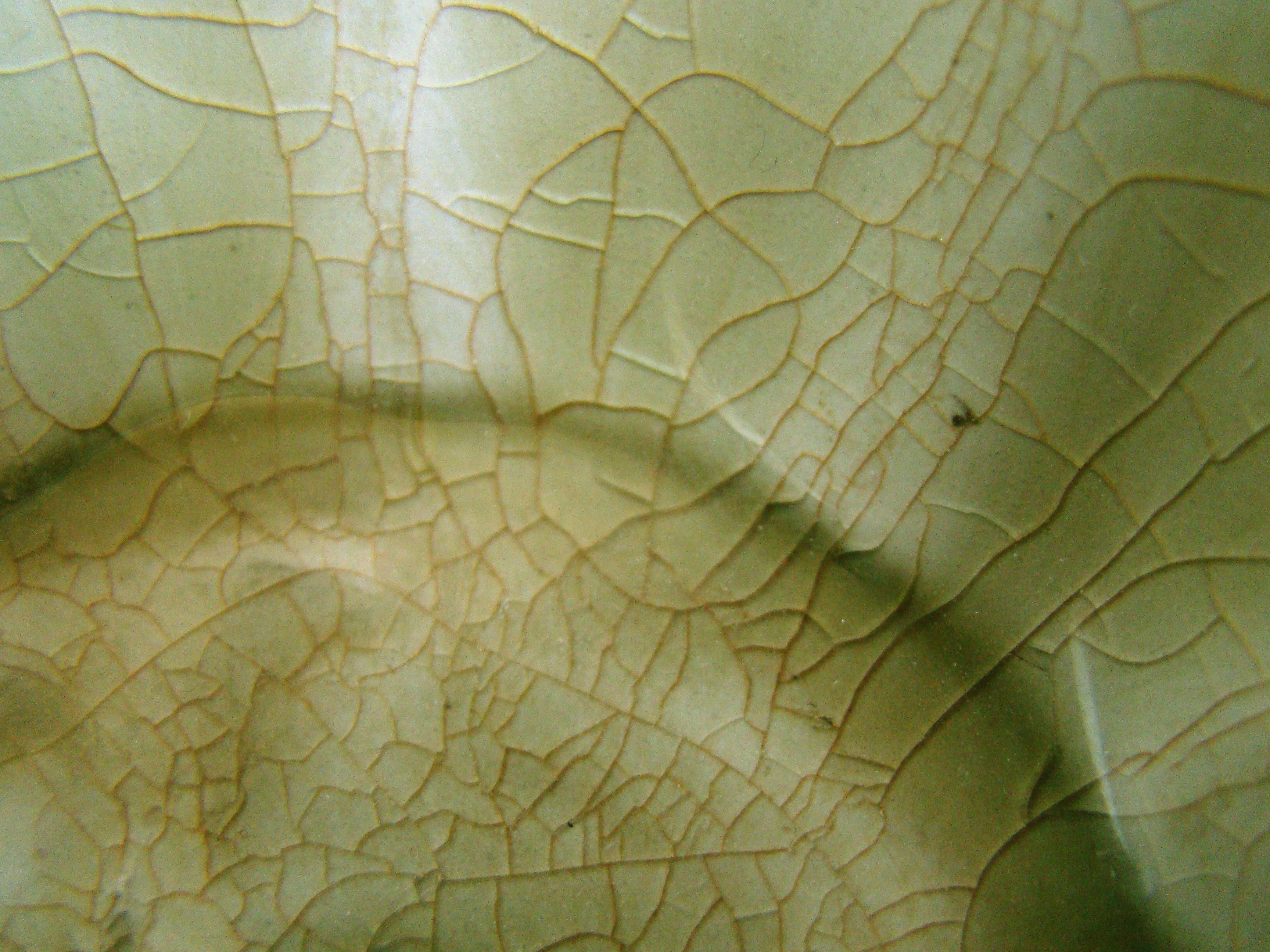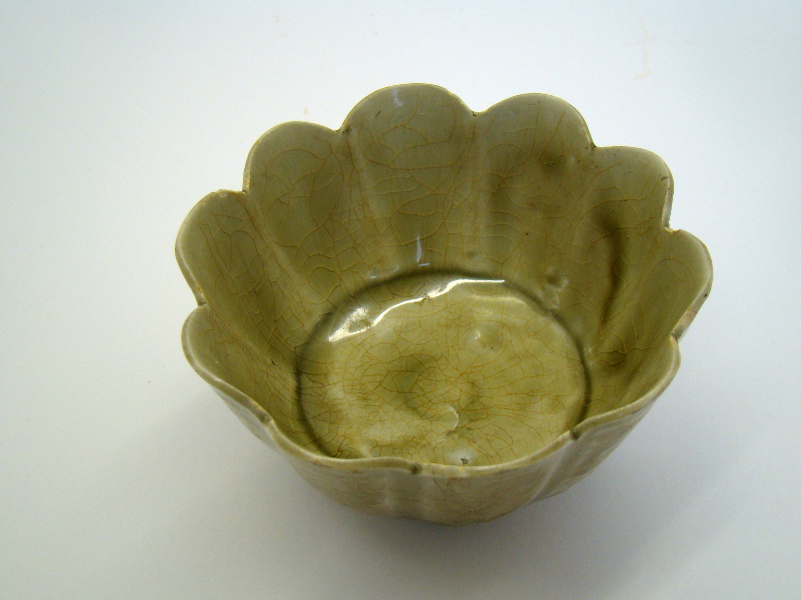 This green glazed cup is hard to determine exactly. It is 6,5 cm high, and has a diameter of 12 cm. The shape is a flower cup shape, which derives from silver or lacquer wares. Some say it could be a ewer warmer. It is made from a light brown clay, and is high fired. The walls are thin, but the base is quite heavy. The petals are cut by hand. The glaze has an amazing crazing to it, and it is colored orange/brown in the cracks. It is a transparent green, with a glassy look.