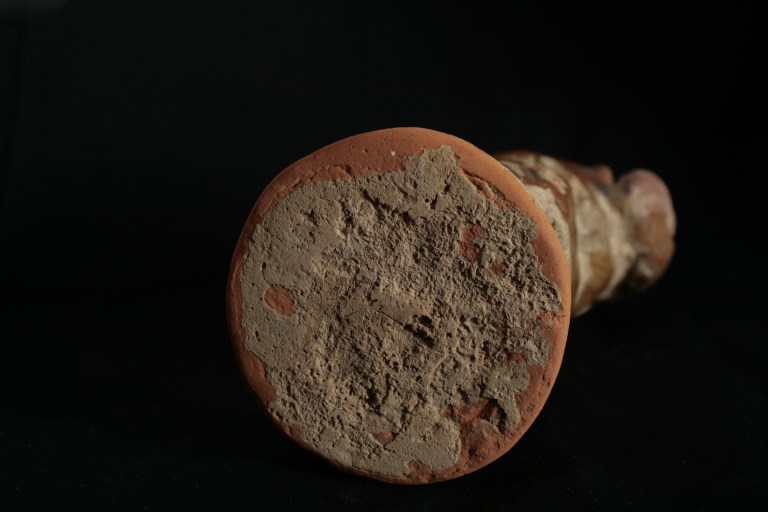 This lovely sculpture is made during the Tang dynasty, showing the cultural mix that came along the silk-route. You would almost describe it as ‘barbarian’, this western trader with robe and half bare chest. He has a nice beard, moustache, and headgear. It is made from a red-fired pottery, 25 cm, and his robe is brown glazed. The body is painted brown, and he probably held something in his left hand.