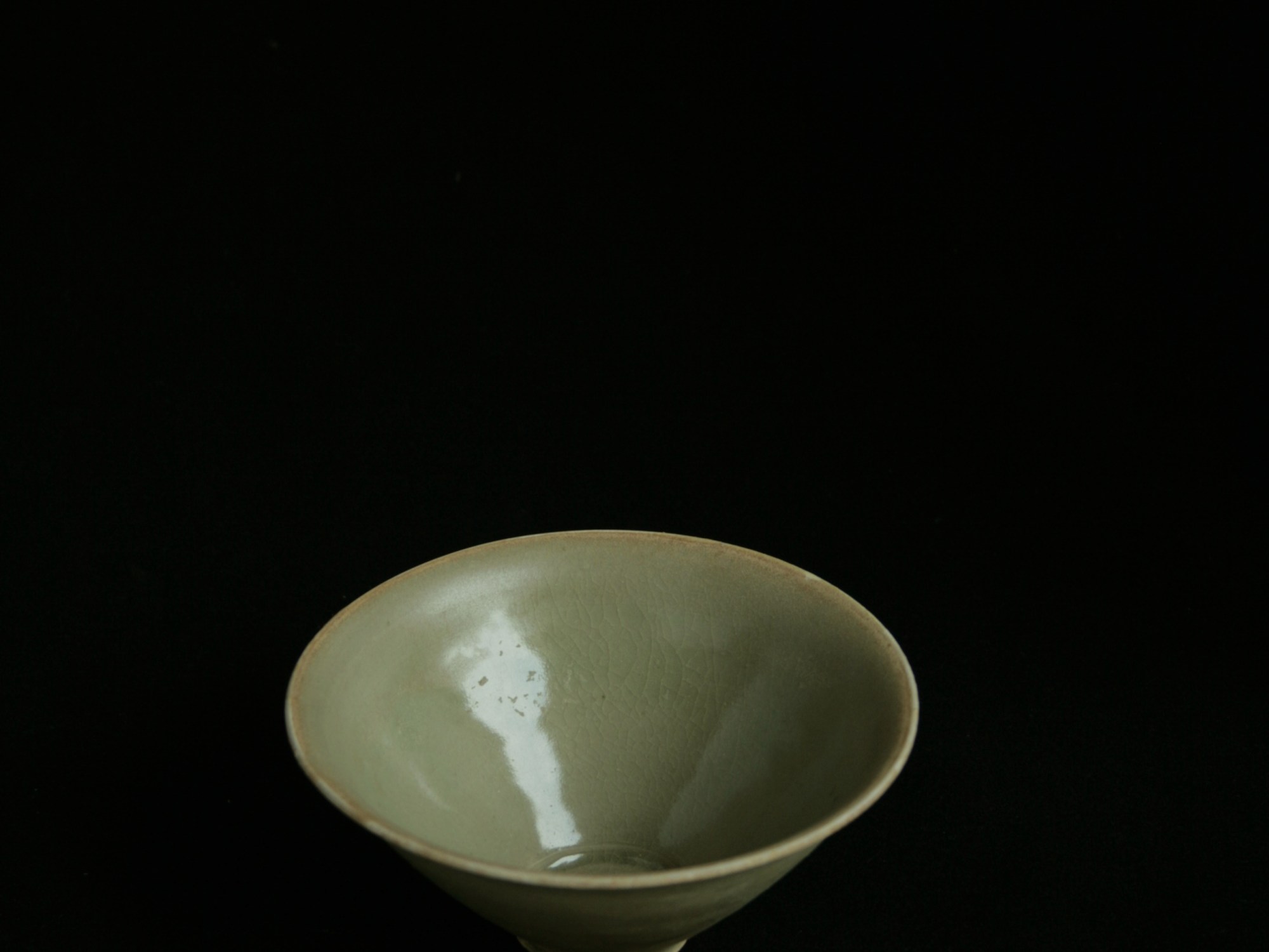 It measures 4,7 cm high and has a diameter of 10,4 cm and weighs only about 60 grams. It is thinly potted and the greyish green glaze is crazed. The inside glaze is more shiny then the matt outside glaze. The clay is a light orangey brown, the footrim cut with a sharp knife. The bowl flares out at the rim, which is a Yaozhou feature.