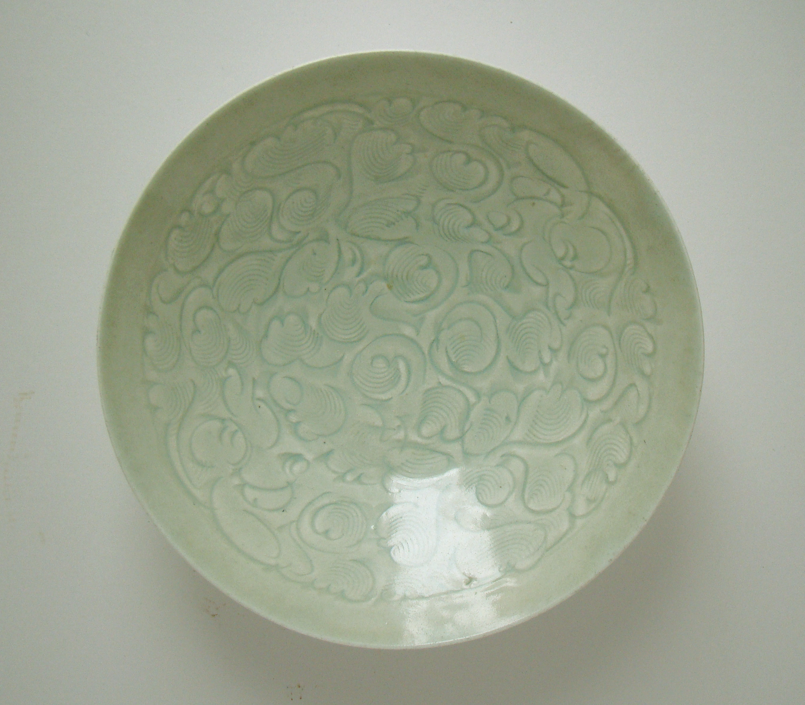 The bowl measures 18,5 cm across, and stands 5,5 cm high.It is made from a very fine greyish high fired porcelain, covered in the famous Qingbai, or Yingqing, shadow blue glaze. The walls are very thin and the bowl weighs 275 grams. It dates from the Song dynasty, 11th to 12th century. The decor is hand carved in the wet clay, and depicts two boys amongst (peony) flowers.