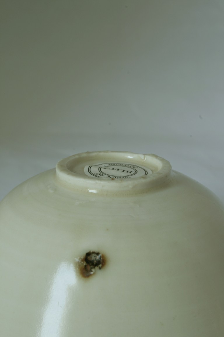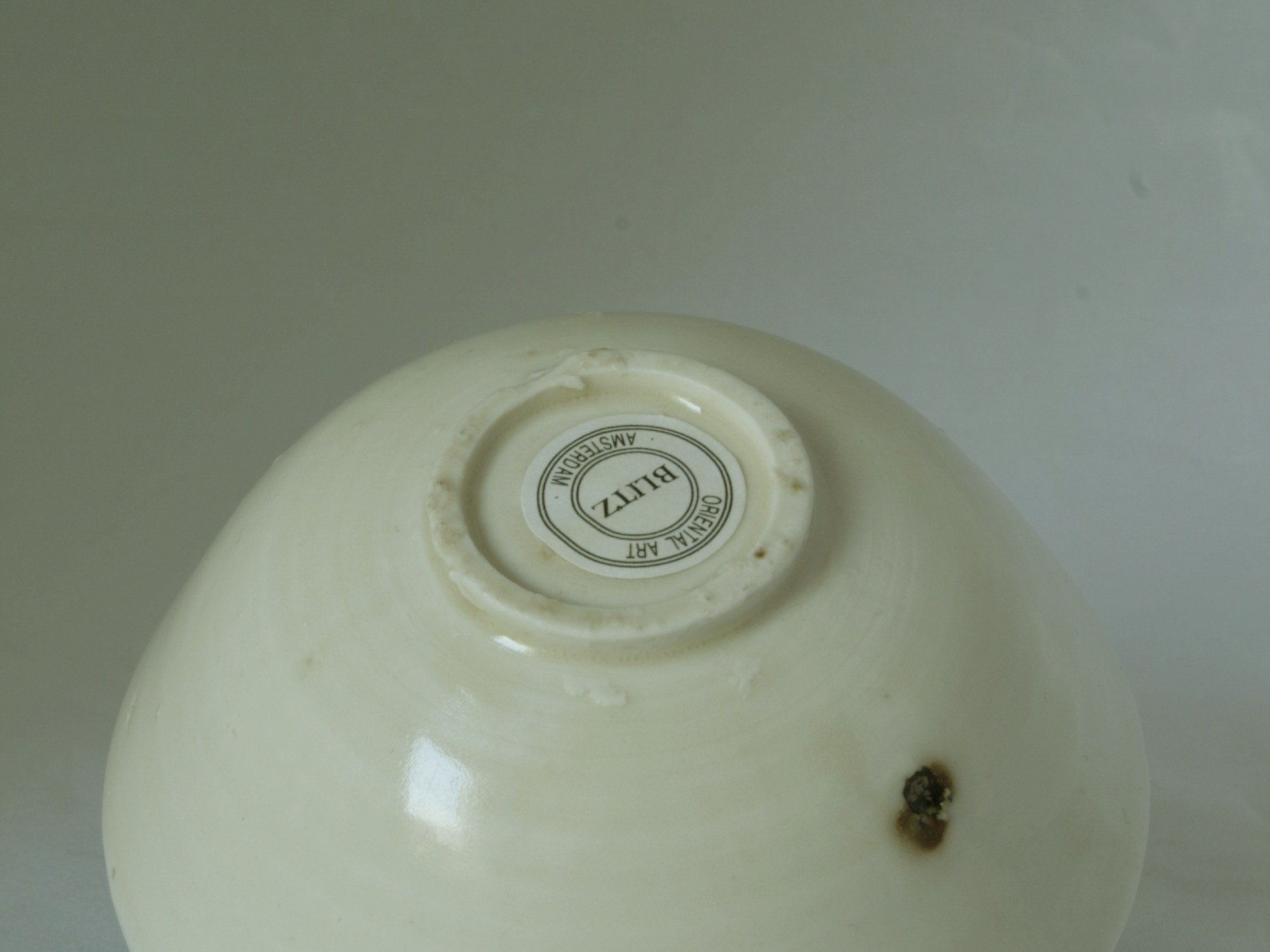 This is a small cup, 7,8 cm. in diameter. Made from a white porcelain, covered in an ivory toned glaze. On the side there is a brown spot, by a iron impurity in the body.