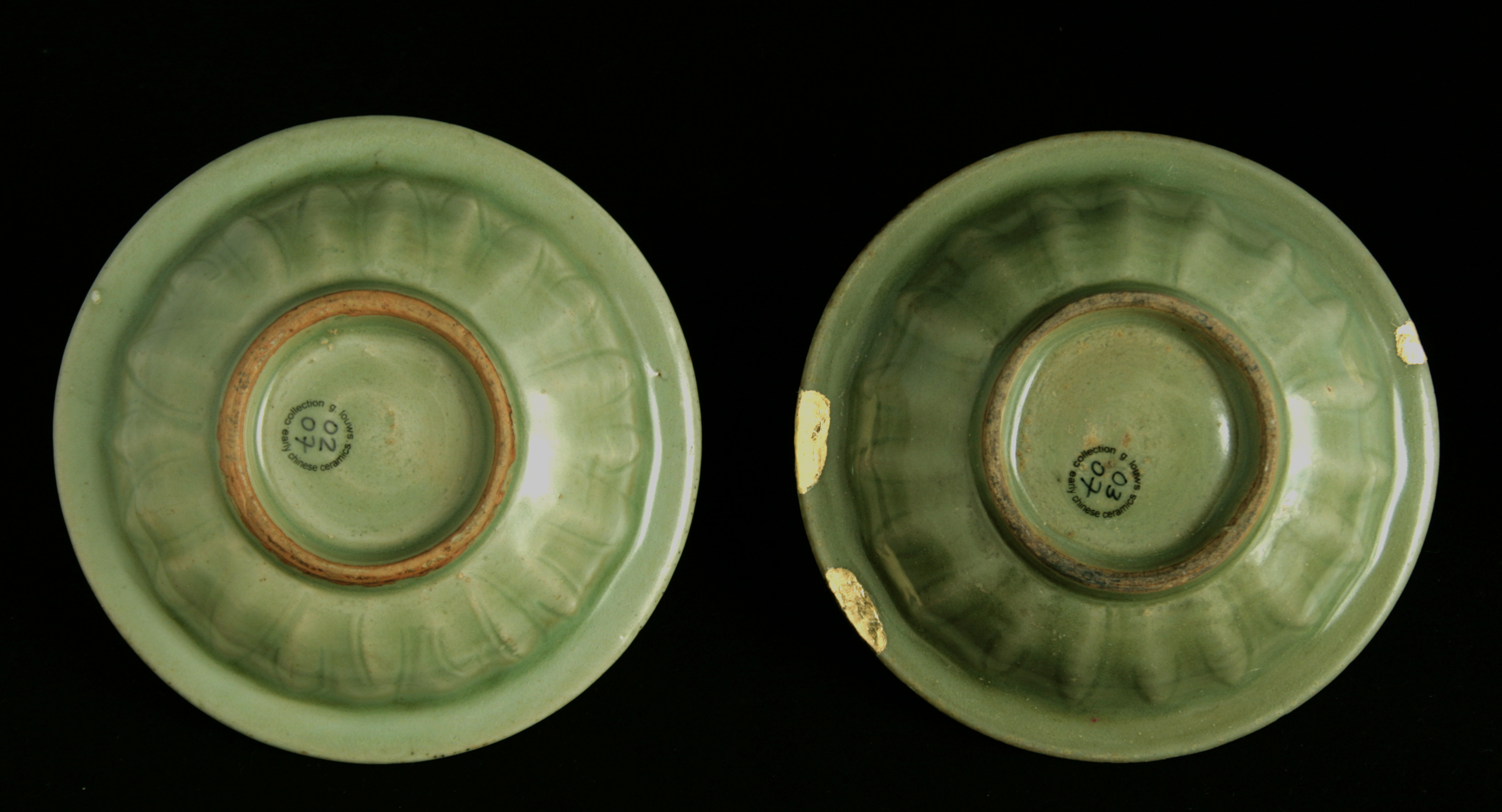 These are Longquan Celadon dishes from the Southern Song dynasty 1127-1279 AD. I bought them together, and it is interesting to see the slight differences in glaze quality. One is 3,6 cm high and 12,2 cm across, and has the best glaze, but damage to the rim. The other one is 3,5 cm high, and 12,4 cm across, the glaze is slightly less deep in color, and more pitted. They are both quite heavy potted.