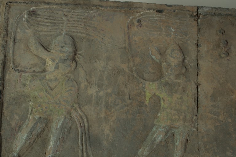 Depicted are Duqu people, a specific class of serving people. They served as soldiers, servants, and in ceremonies. On this tile musicians are shown, blowing long horns decorated with ribbons. To the right there is a fragment left what was probably a drummer.