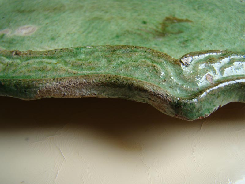 The clay was impressed with a pattern of three flowers and a leaf-like pattern. A lot of these wares are sancai glazed, but the green ones are also documented.