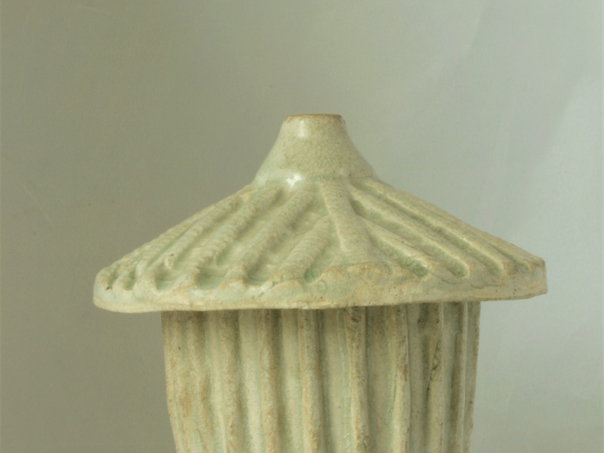 This is a model of a granary, a burial object, model of an actual granary building. This one is made from a white stoneware clay, covered with a bleu-ish Qingbai glaze.