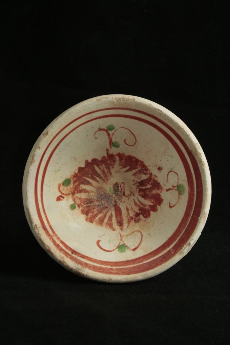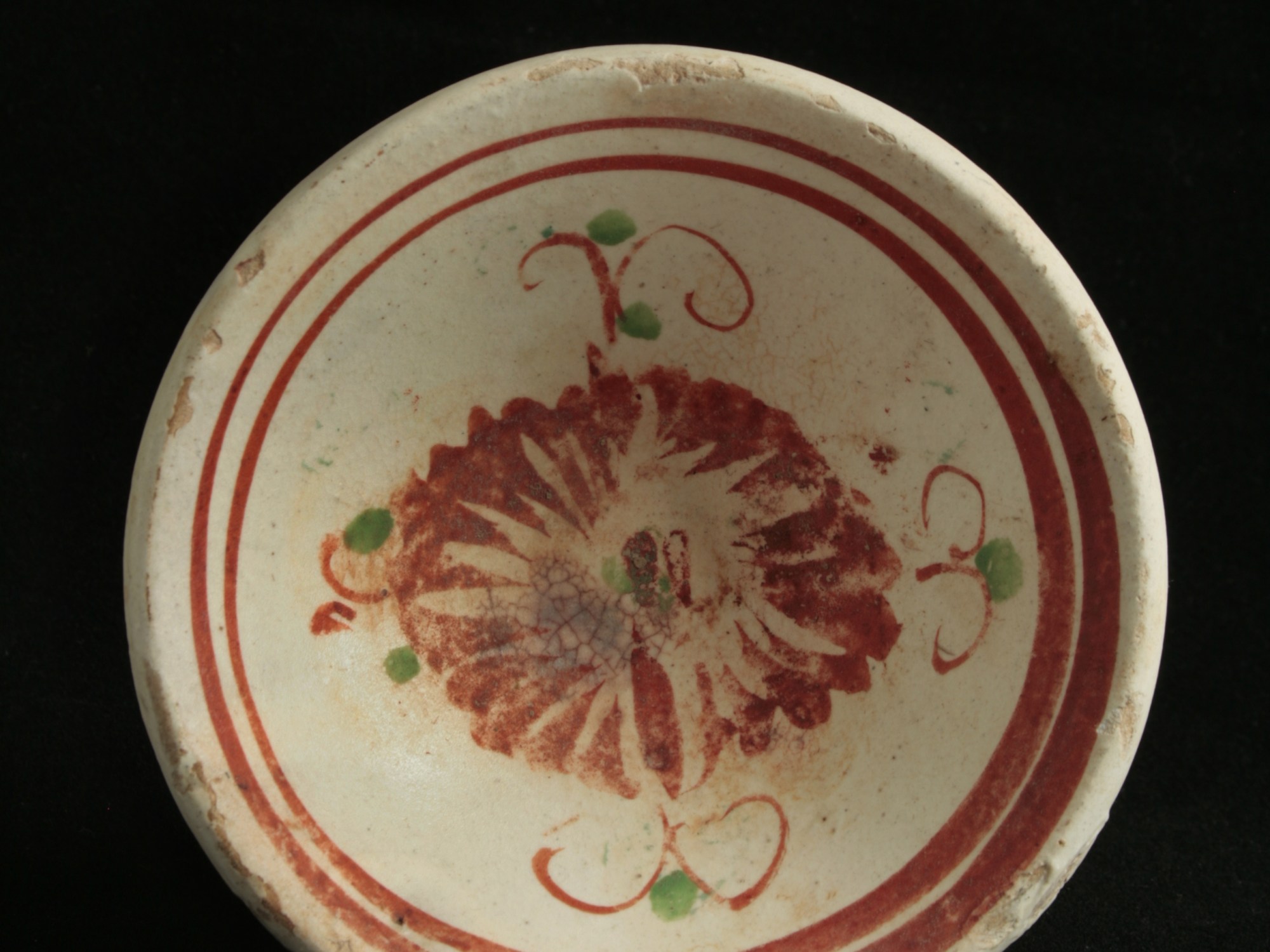 From a French private collection I bought this lovely small bowl. This piece is 10 cm. across, and is heavy potted from a yellowish clay. It has a white slip, covered with a red and green decoration, which are painted over a clear glaze.