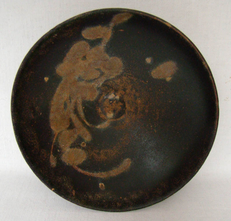 The bowl was first covered in a brown slip-glaze, just stopping above the foot. A dark glaze almost covers this brown layer. Both probably applied by dipping it in the glaze. The decoration is painted in buff brushstrokes, with a masterful hand. Probably using a paste of ash, water, and maybe some slip.