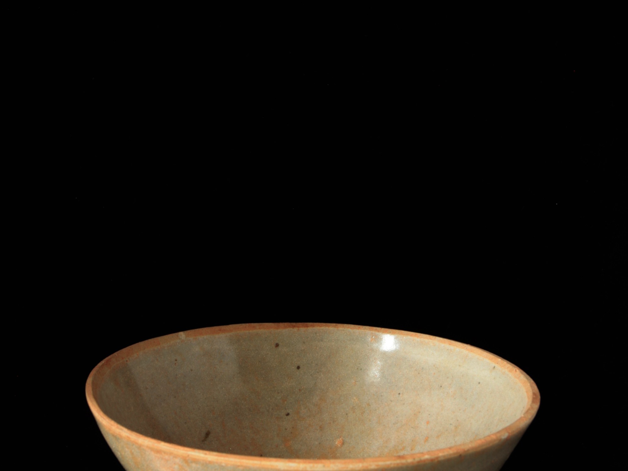 This bowl measures 15 cm across, and is made of a red-burnt stoneware. It is covered in a blue-grey glaze. It is a qingbai type bowl, but from a lower quality, Yuan dynasty.