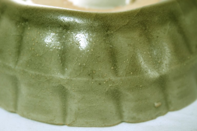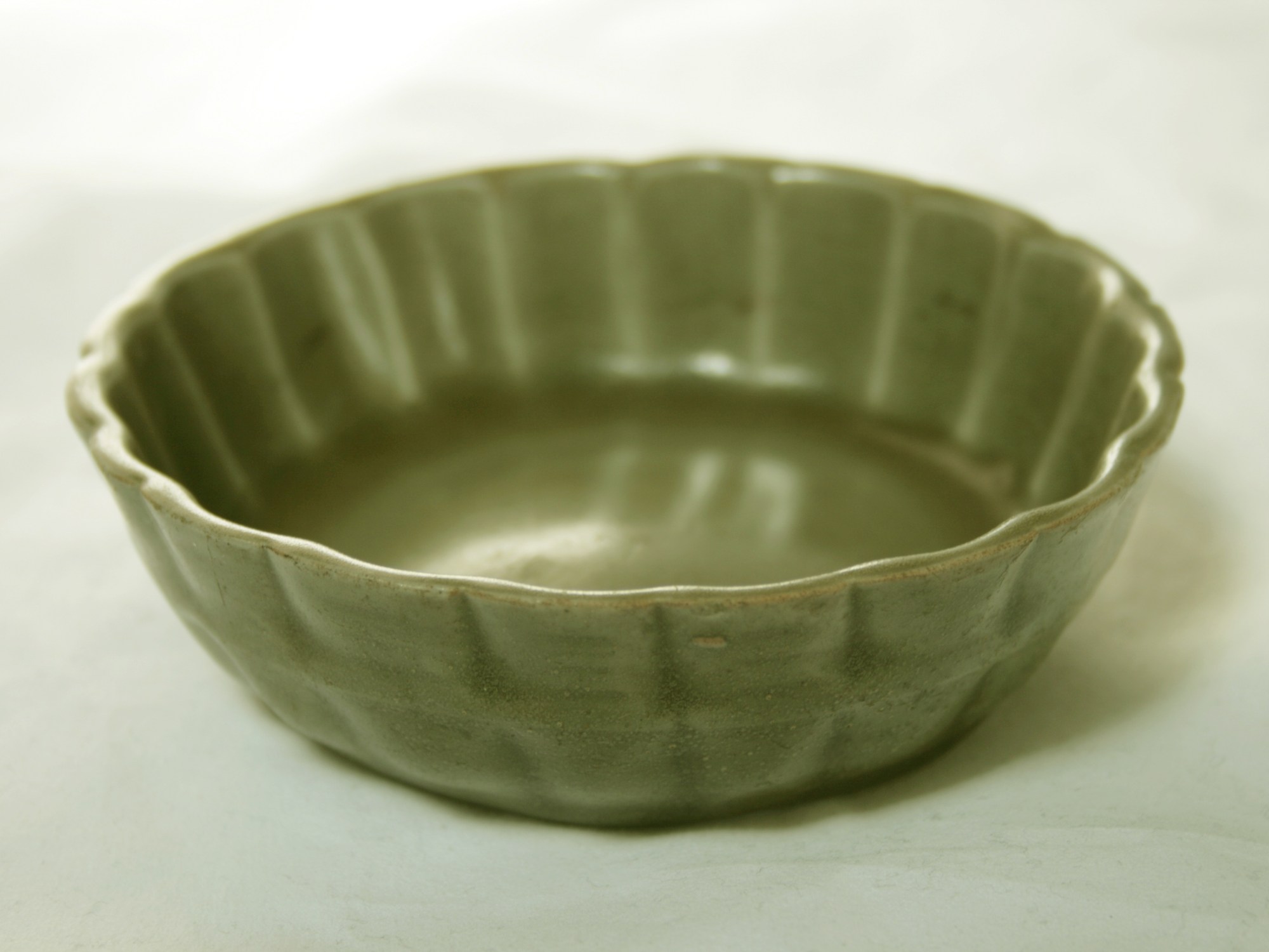 A Longquan Chrysanthemum shaped brushwasher, Yuan / early Ming. A lovely olive green glaze, signs of wear and age, but great condition. 12 cm in diameter, quite lightly potted. These brushwashers were made from the Song till the Ming dynasty, so exact dating is difficult. The shape is also referred to as bamboo node or sugar cane shape. A similar brushwasher is seen in the Mak.Frankfurt, and a similar shaped one in the Metropolitan museum with a superior glaze.
